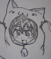 ていうことで、夏の間鍛錬を重ねた「擬人化」というテーマにそった作品。擬人化といってもまぁ「モノ」ではなく、掲示板に住み着いているコテの人を、想像だけで擬人化するということです。まぁこの際だから言いますが。「複製ねこ」という名から想像したキャラクターです。ハイハイセンスないセンスない。